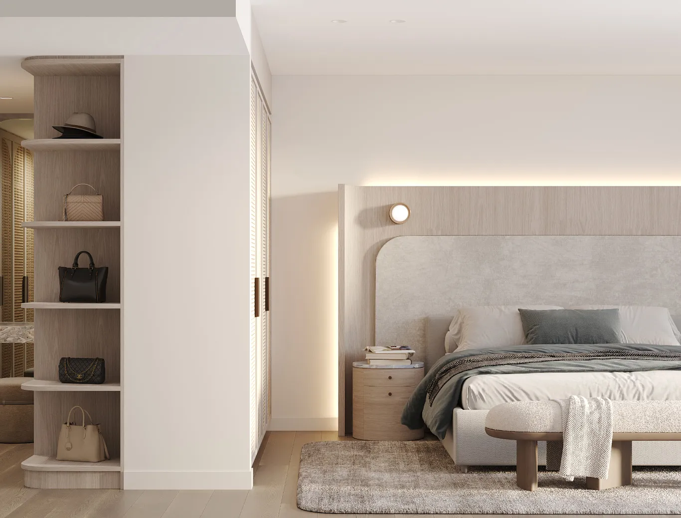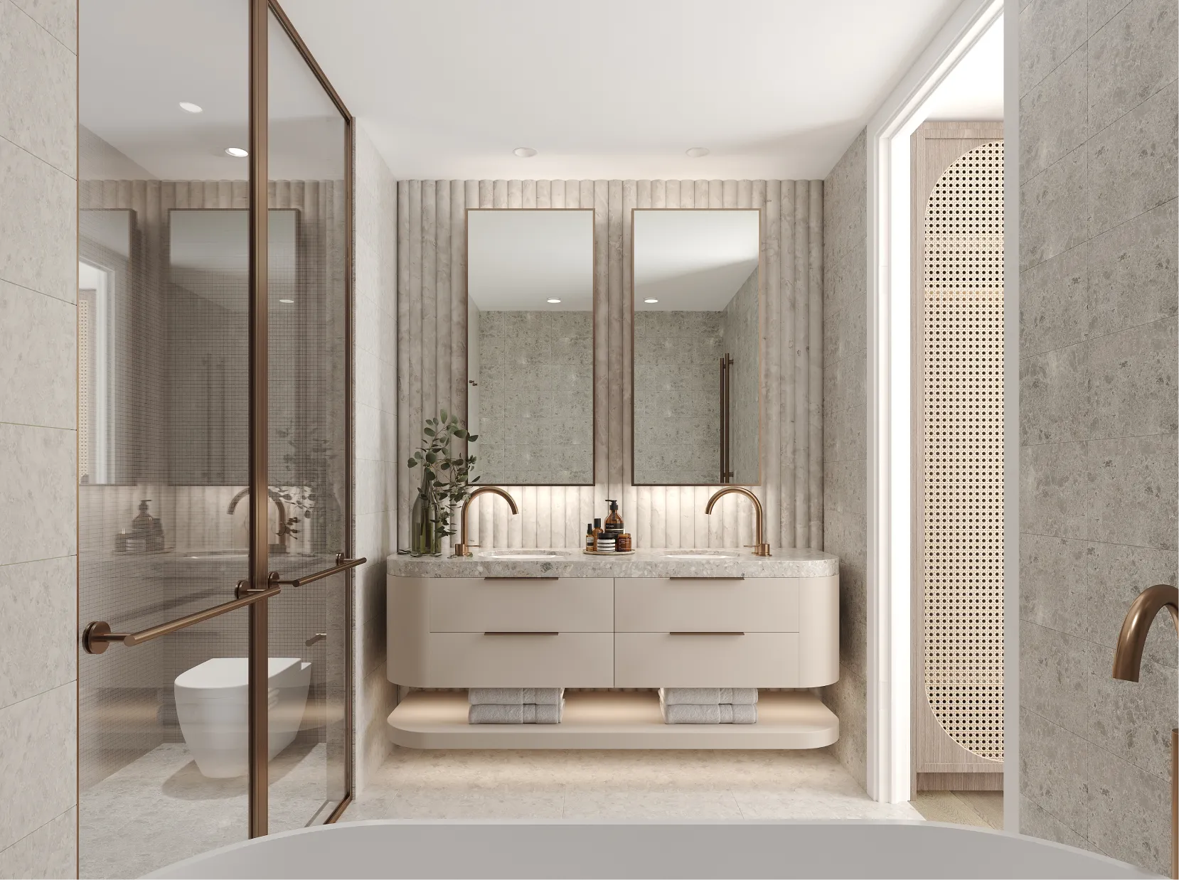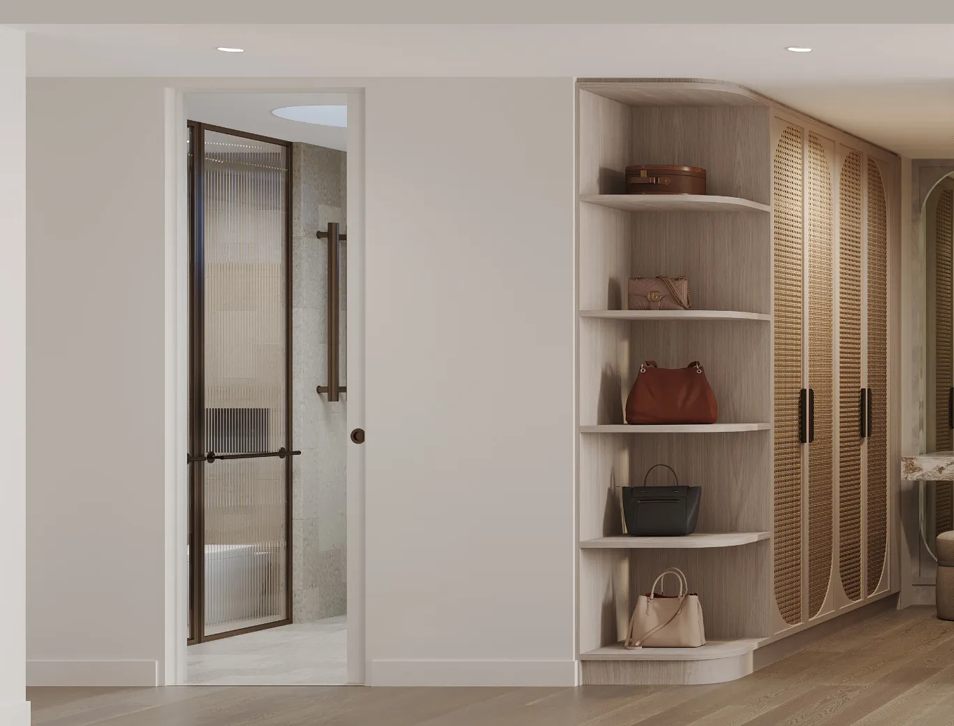 The primary suite has an elegant walk-in wardrobe, which features open shelves for display. Full height robes are hidden behind stunning doors, inlayed with woven cane rattan and adorned with bronze handles by Lo & Co. The curvaceous mirror and striking marble vanity is paired with tactile surfaces to create a feeling of warmth. This is more than a place for belongings but an inviting space to make simple rituals a joy.