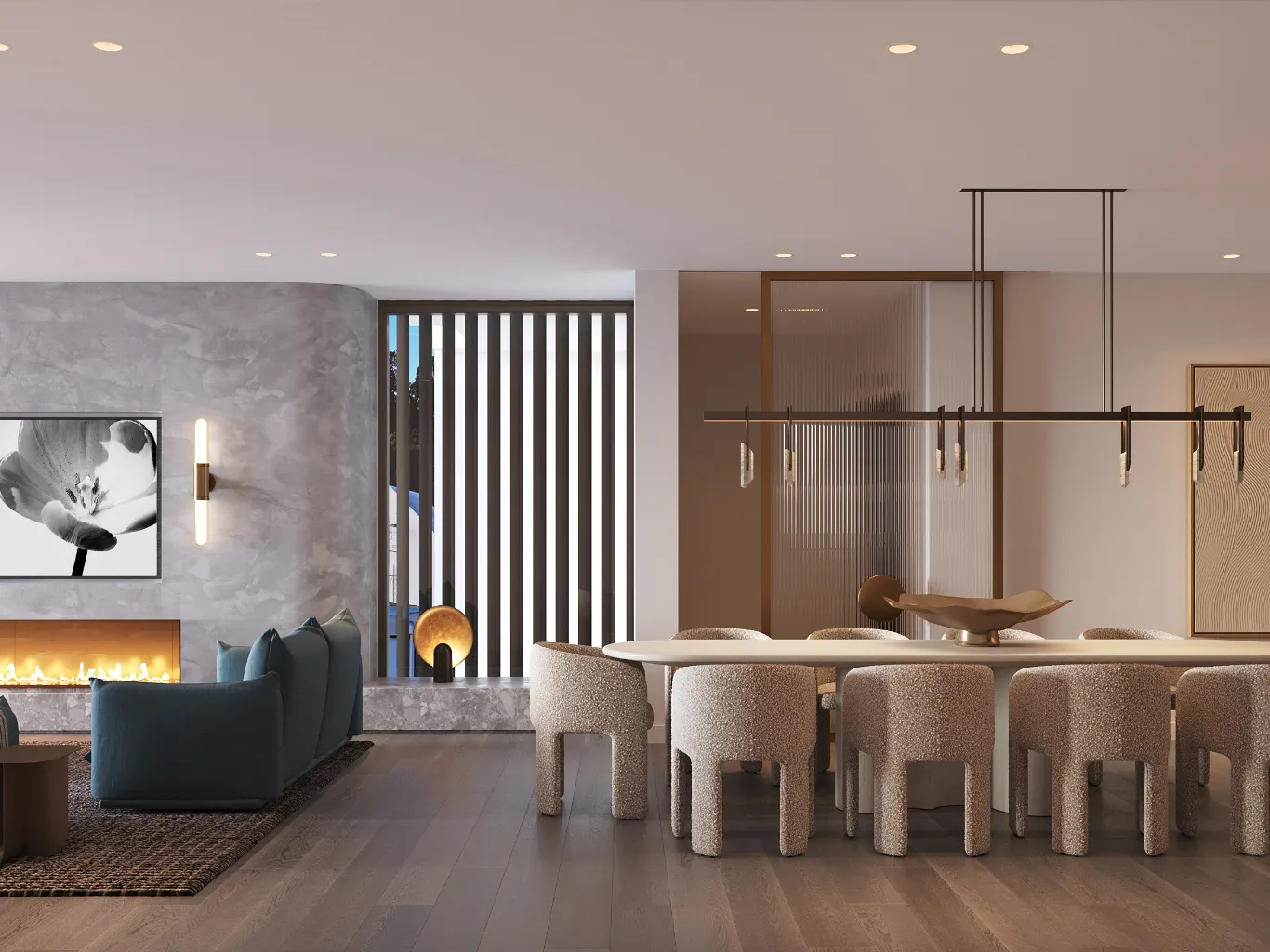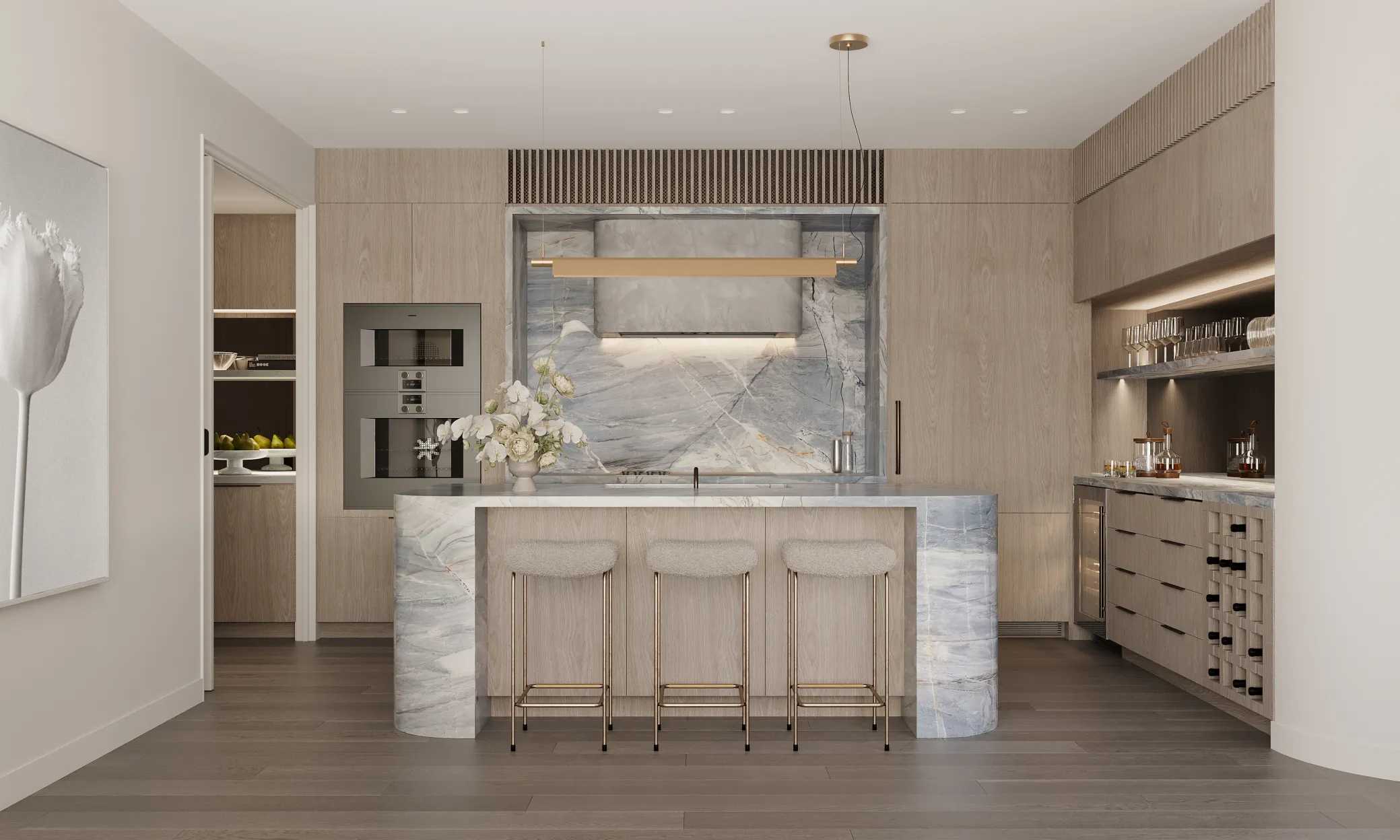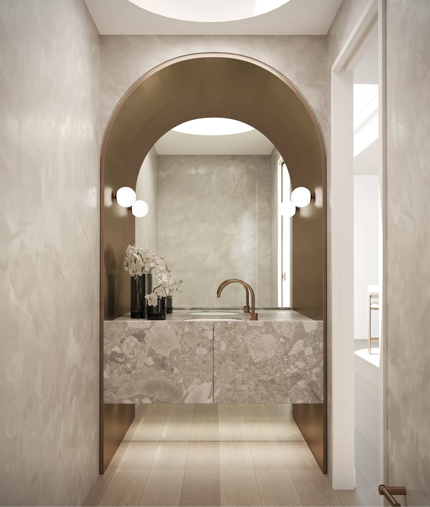 A space where every detail and texture has been honed, this is a place to relish in the simple pleasure of being at home. The sculptural curves of venetian plaster, sharp lines of marble and soft lime washed oak flooring blend to create a sense of warmth and sophistication.