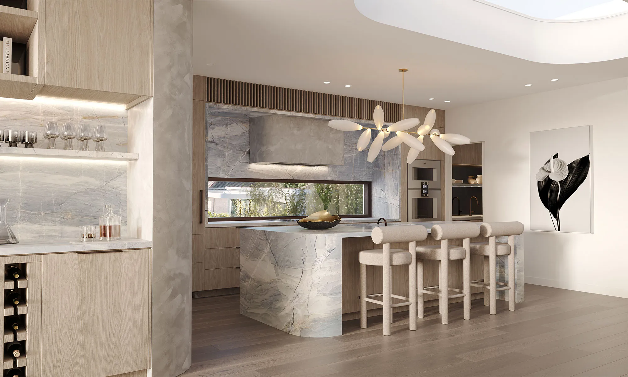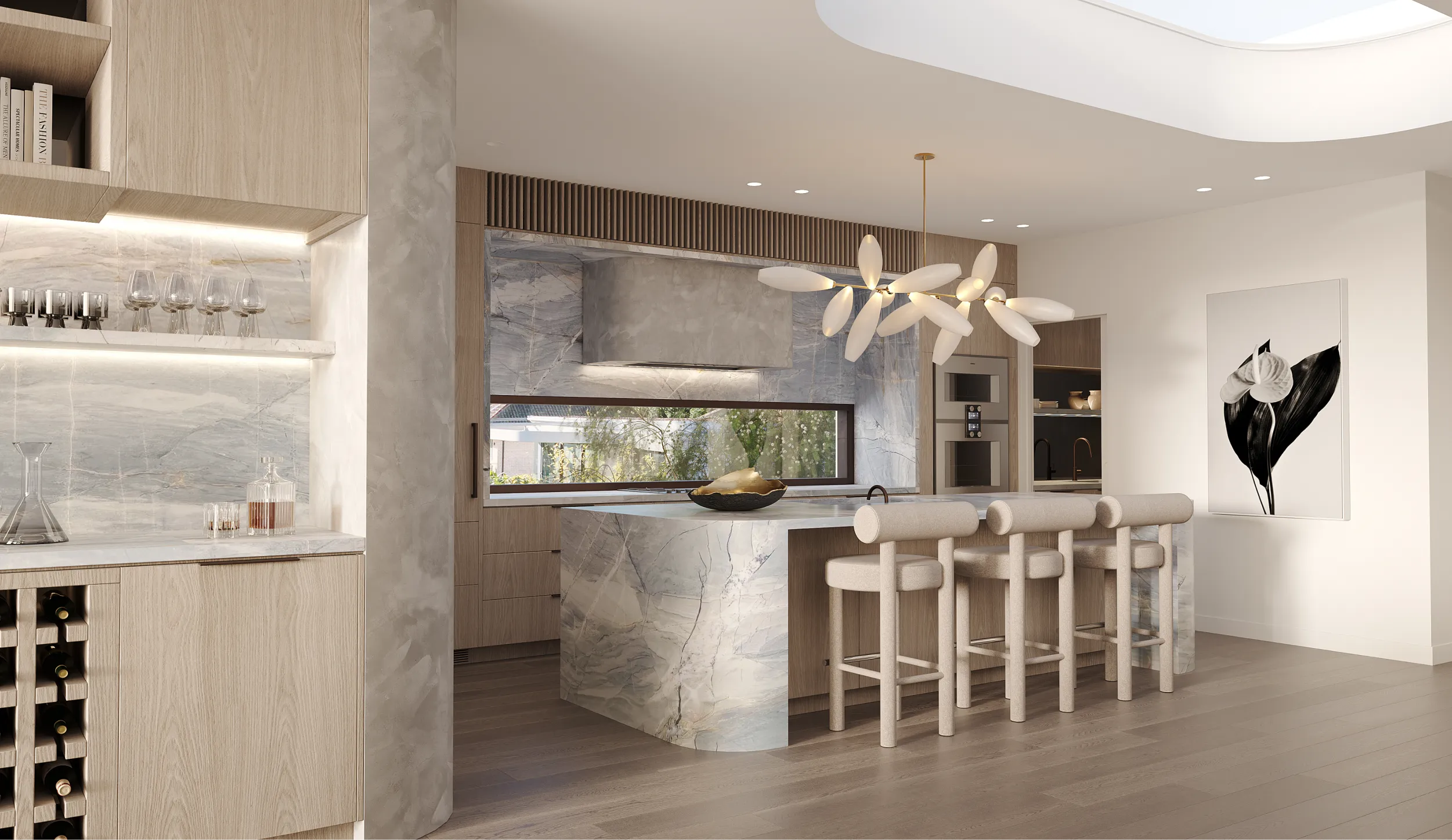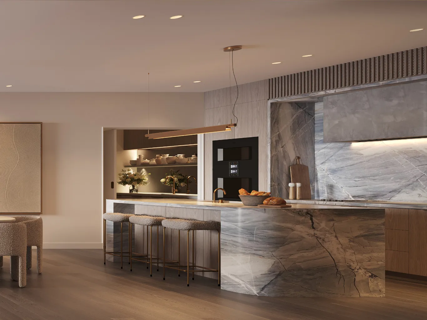 Premium appliances, Gaggenau and Sub Zero, are paired with high quality finishes that are designed to endure. A feature rangehood, sculpted in venetian plaster, creates a soft counterpoint to the strong slabs of blue hued quartzite and bronze fixtures and tapware. Crafted with consideration for daily life and its big occasions, the kitchen is equipped with Vintec wine fridges and expanded by a generous scullery. Large in scale and presence, this is a space that embraces its position as the heart of the home.